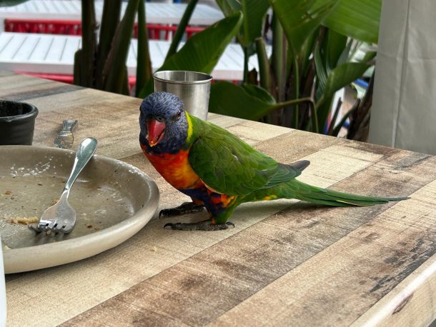 Husky itself is a nice enough, if a little touristy, town and we managed to find a place for coffee, which turned into breakfast number two, and excellent it was too. The local, very colourful and tame, parrots kept us occupied whilst we did a bit of people watching and chatted.